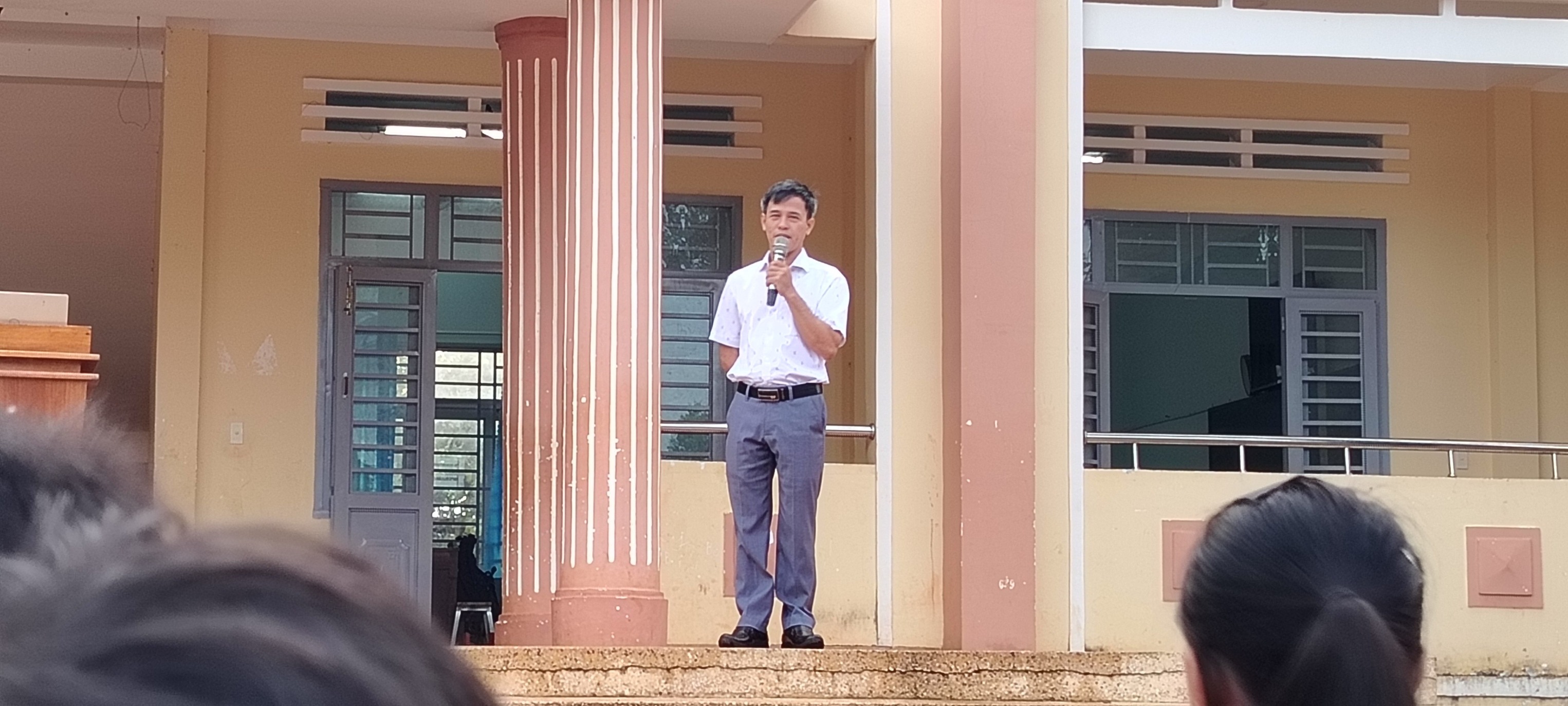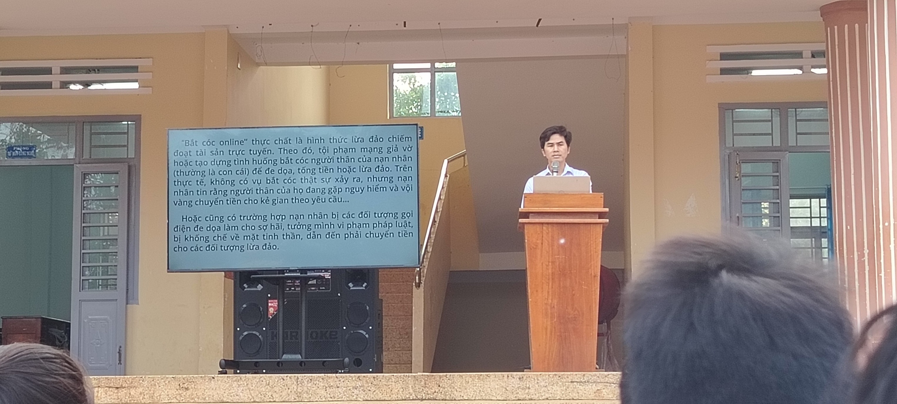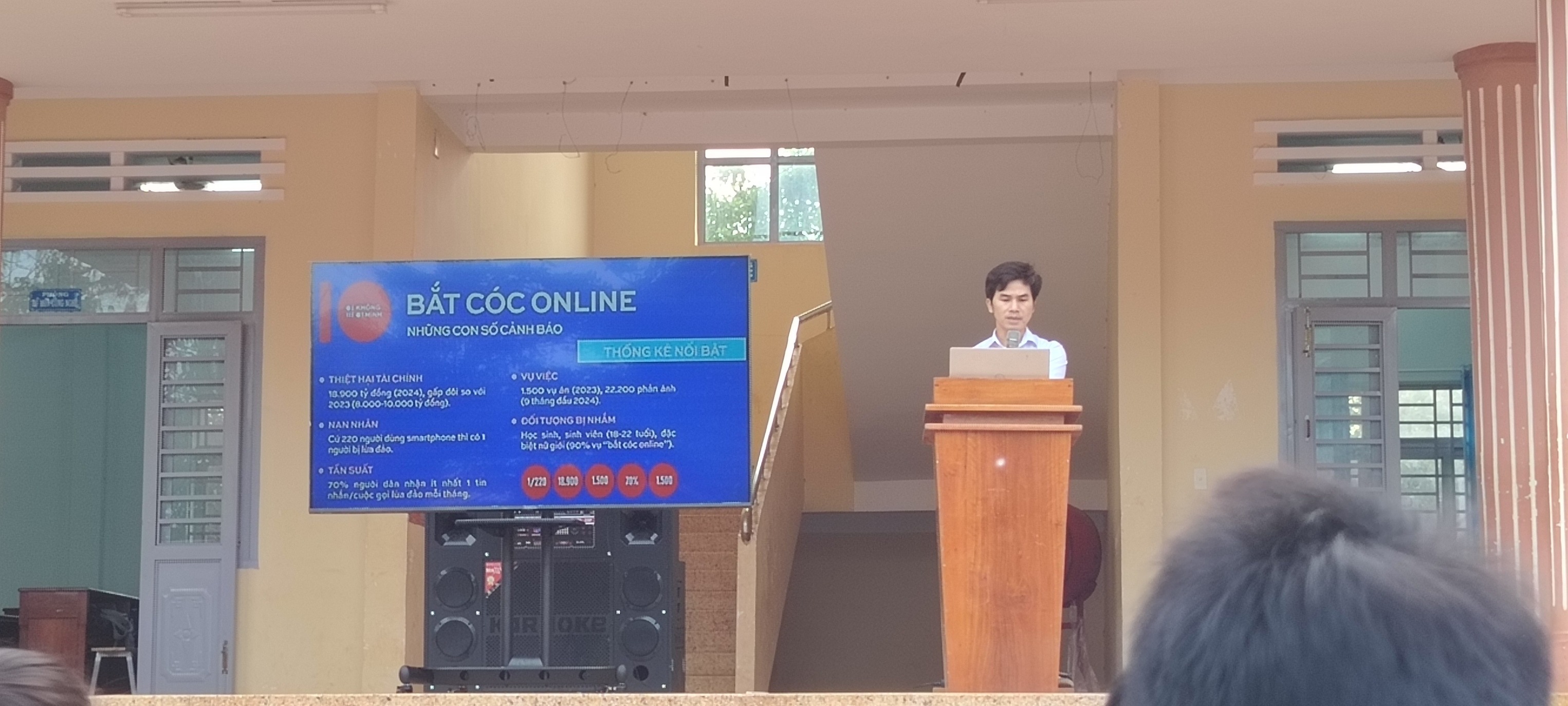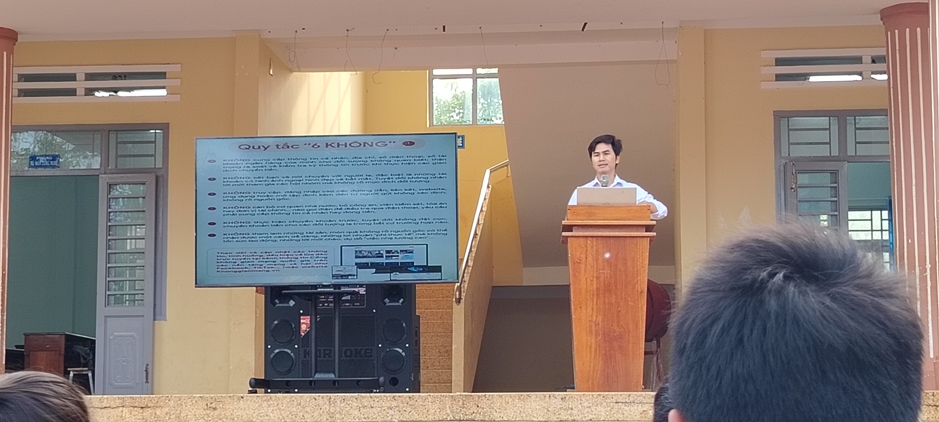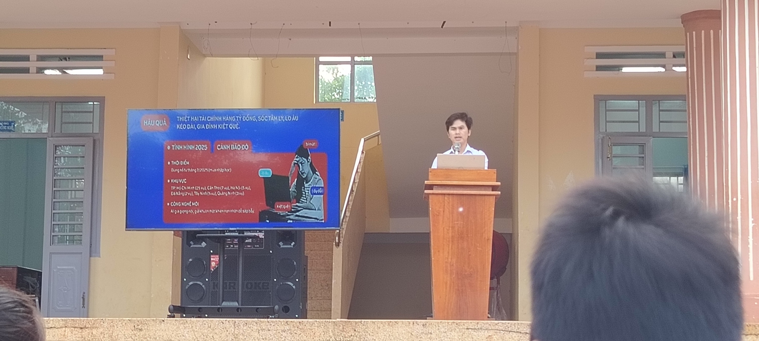 🗣️ Thầy Dương Văn Đại – Phó hiệu trưởng nhà trường đã chia sẻ những kiến thức quan trọng về nhận diện lừa đảo, bảo mật thông tin và kỹ năng tự bảo vệ bản thân khi tham gia môi trường mạng.